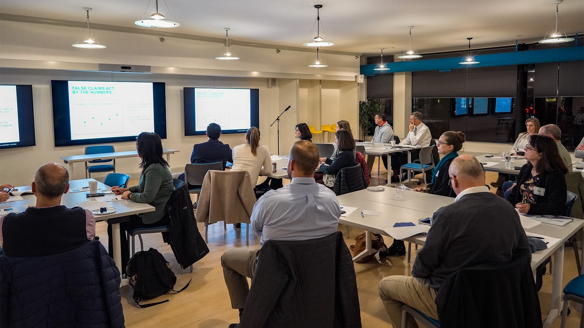 Attendees at the Rutland Regional Medical Center (RRMC) event gather in The Hub CoWorks’ large, tech-enabled Streetside Conference Room in downtown Rutland, Vermont. The modern coworking space features collaborative seating, state-of-the-art Cisco Webex technology for hybrid meetings, and three large screens displaying healthcare data and presentations, including topics like the False Claims Act. The room’s sleek design, natural light, and professional yet welcoming atmosphere make it ideal for events, meetings, and presentations.